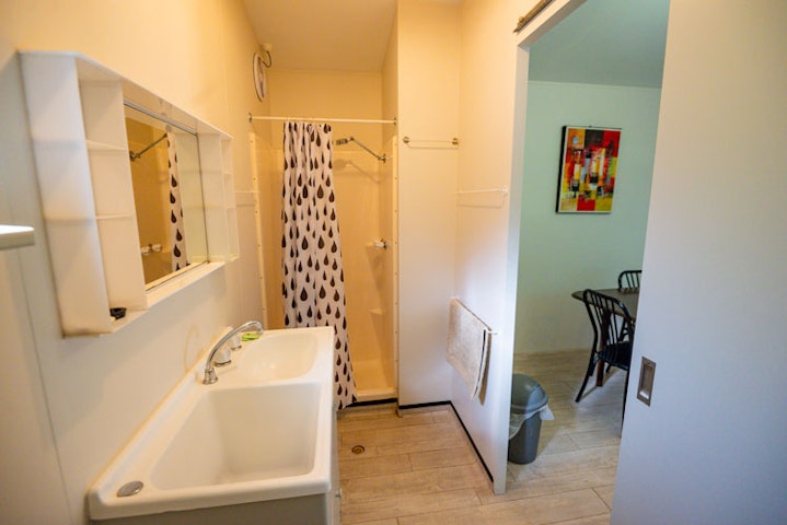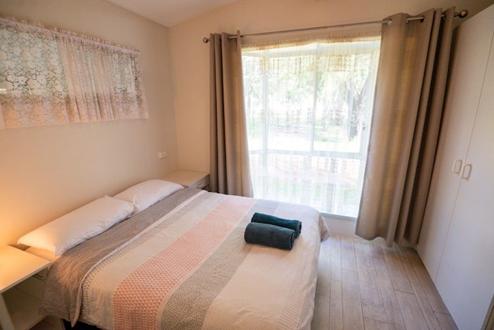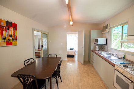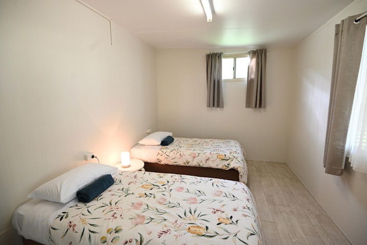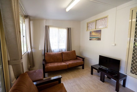 The two-bedroom park homes include fresh linen for your stay, a kitchen with utensils and a small shaded outdoor area. The main bedroom includes a double bed, with two single beds included in the second bedroom.