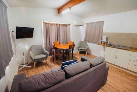1 Bedroom with comfortable queen size bed. 1 Bedroom with 2 sets of bunk beds (sleeping 4). Fully self-contained kitchen. Lounge. Television. Inside dining table with chairs. Bathroom/toilet. Air conditioning. Outside table and chairs. Towels and linen supplied