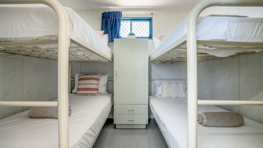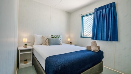 These Chalets have two bedrooms, one with a queen bed and the second bedroom with 2 sets of bunks. All linen is provided. The chalet is equipped with a microwave, kettle, toaster, crockery, cutlery, 2 burner gas bench top cooker, fridge, iron & ironing board, hairdryer and air conditioner. The family room has a dining table and lounge chairs. The chalet also has an outdoor sitting area.