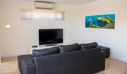 Modern fully self contained equipped kitchen with fridge, microwave and oven with hot plates. Lounge, dining room, reverse cycle air-conditioning, 55" TV.