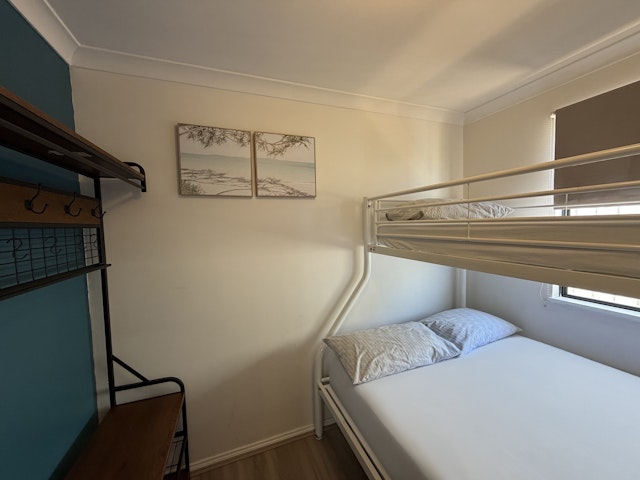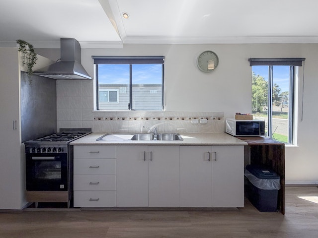 Our Pet Friendly Two Bedroom Family Cabin is the perfect accommodation choice for a family. With a light and airy feel, spacious open plan kitchen, lounge, and dining area, there is plenty of room for the whole family. A protected deck allows you to sit and relax whilst giving the kids the option to explore the Park’s many features. The main bedroom boasts a queen size bed with crisp white linen whilst the second bedroom accommodates up to 3 children in a double bed with a single bunk on top. The bathroom has a modern shower suite and the kitchen comes complete with all the necessary equipment and utensils to make your stay at Sunset Beach a home away from home experience. The deck is spacious accommodating a large table and chairs.