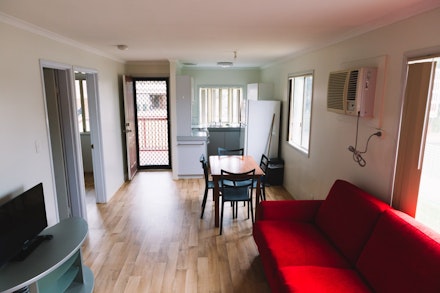 This cabin has a queen bed in one bedroom and a set of bunks in a second bedroom. There is a small kitchen and separate living area. A rollaway bed can be put in this cabin to accommodate an extra person. It has a bathroom with toilet and an air conditioner. The kitchen contains an oven, microwave, fridge/freezer, frypan, kettle, toaster, cutlery and crockery etc. Linen is included. There is a TV with built in DVD player, and a small patio. Please note we DO NOT allow pets to accompany you when staying in our on site accommodation.