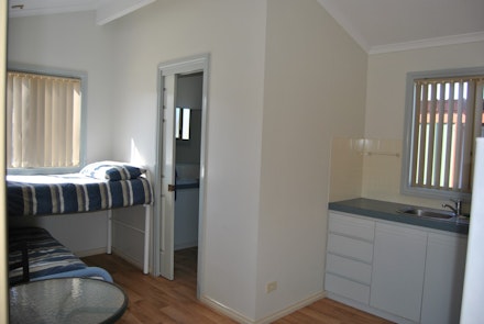 This cabin has a queen bed in the bedroom and a set of bunks in the living area. This is a smaller cabin, and so is really suited to 2 adults 2 children or 3 adults. It has a bathroom with shower and toilet, and an air conditioner. There is a small living/kitchen area with stove top, microwave, fridge/freezer, frypan, kettle, toaster, cutlery and crockery etc. Linen is included. There is a TV with built in DVD player, and a small patio. Please note we DO NOT allow pets to accompany you when staying in our on site accommodation.
