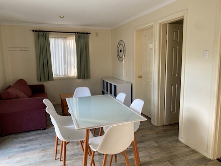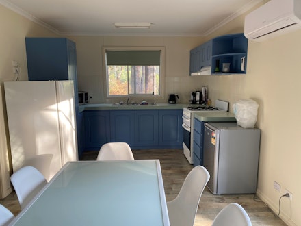 The Cottage sleeps 6 people with a Queen bed in one room , a Queen bed and a bunkbed in another room, kitchen/dining area and a small lounge with air conditioning. The kitchen has a microwave, full fridge/half freezer, oven and stovetop, Nespresso coffee machine, toaster, kettle and all kitchen utensils. The bathroom consists of a shower and basin but the toilet is shared at the nearby ablution block. Also an undercover verandah, outdoor table & chairs and BBQ ( plus there’s a firepit area for the winter months). Linen and towels all included.