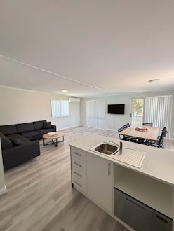 Our Three Bedroom Cabins are great for families! Sleeping a maximum of 7, located a short distance across from our jumping pillow, playground and pool area, facing out onto our Sites, our Three Bedroom Cabins are fully self contained. The main bedroom has a king bed, second room has 3 king single beds, and third bedroom a further 2 king single beds. A fully self contained kitchen with dishwasher, bathroom, separate toilet and dedicated lounge and dining areas. All linen and towels provided. Parking for one vehicle.