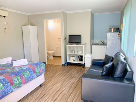 Recently renovated, the motel-style cabin is suitable for solo travellers and couples exploring the southwest with a queen bed - complete with fresh linen and bath towels for guests. While the motel-style cabin does not include a kitchen, it does have coffee, tea and toast-making facilities, as well as a fridge and microwave.