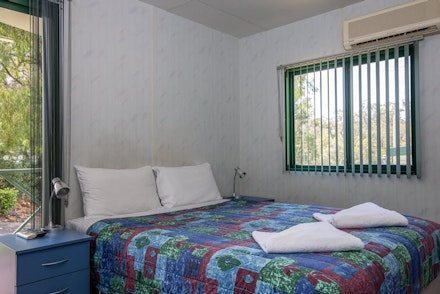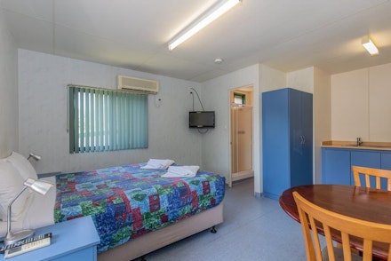 This is an open-plan cabin with one main living area which includes a queen-sized bed, cooking facilities and a dining area. The studio holiday unit also includes an ensuite bathroom, TV, reverse cycle air-conditioning and fresh linen.