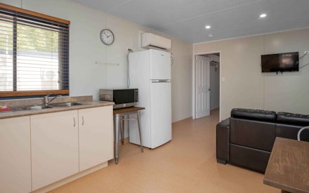 The one bedroom cabin at Eighty Mile Beach Caravan Park is ideal for couples. The air-conditioned cabins have a queen bedroom, a bathroom, a fully equipped kitchen, a television, and a veranda with barbecue facilities.