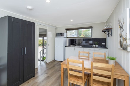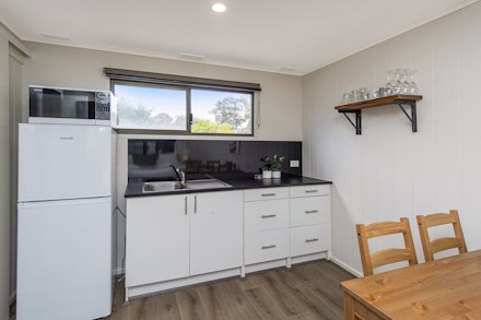 This fully self-contained open-plan cabin featuring a queen bed, its own ensuite and an annex with one set of bunks (2 single beds) and a lounge suite. The cabin contains a kitchenette with convection microwave, fridge, electric frypan and utensils. It also equipped with a Flat Screen TV and reverse cycle air conditioning/heating. The tariff includes all linen and towels. Complimentary tea, coffee and sugar are also provided to see you through for a few days.
