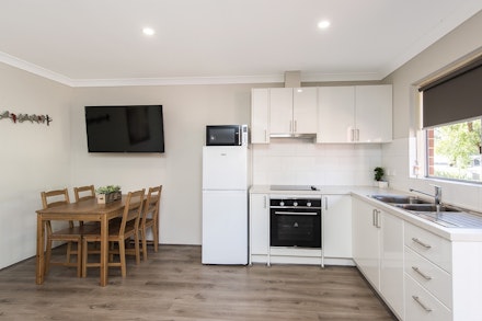 This fully self-contained chalet features one bedroom with a king size bed and ensuite and two sets of bunks (4 single beds) in the living area, as well as a second bathroom. The kitchen/dining area includes a convection microwave, fridge, stove cook top and oven, flat screen TV , table and chairs and a sofa that folds out to a queen size bed if required, along with reverse cycle air conditioning/heating. The tariff includes linen. Complimentary tea, coffee and sugar are also provided to see you through for a few days.