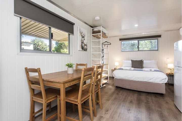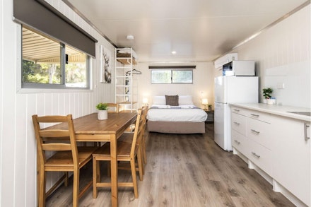 This fully self-contained open-plan cabin features a new kitchenette with convection microwave, fridge and cooking supplies, a flat screen TV and reverse cycle air conditioning/heating. The tariff includes all linen and towels. Complimentary tea, coffee and sugar are also provided to see you through for a few days. Free parking is provided in the undercover carport.