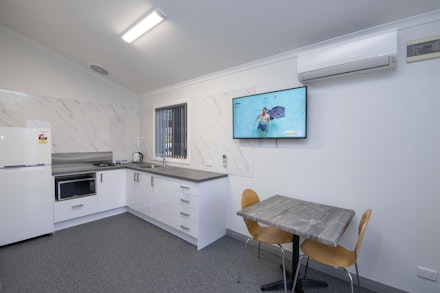 The Motel Style cabin offers guests all the comforts of home in one compact unit. It has a queen size bed, small dining area, an LCD TV with DVD player and a fully self-contained kitchen all in one open plan space with an ensuite next to the bed. The kitchen comes equipped with a microwave and stove top burners, crockery, cooking utensils and cutlery. This cabin is air conditioned for summer and has heating for the cooler months with a reverse cycle air conditioner in the living area.