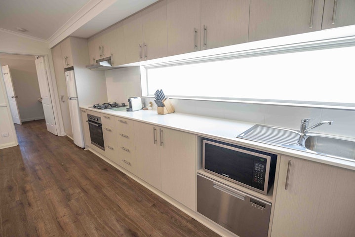 The spacious open-plan kitchen, dining and living area features air-conditioning, a dining table and chairs, comfortable three-seat couch, large flat-screen television and a large fully equipped kitchen, including all cooking utensils, kettle, toaster, Nespresso coffee pod machine, fridge, gas stovetop, oven, microwave and dishwasher.
