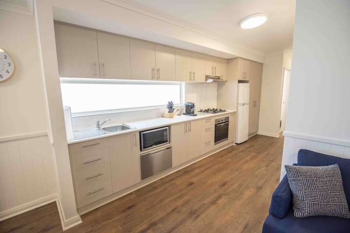 The spacious living and dining area features air-conditioning, a large dining table and chairs, comfortable L-shaped couch, large flat-screen television and a spacious fully equipped kitchen, including all cooking utensils, kettle, toaster, Nespresso coffee pod machine, fridge, gas stovetop, oven, microwave and dishwasher.
