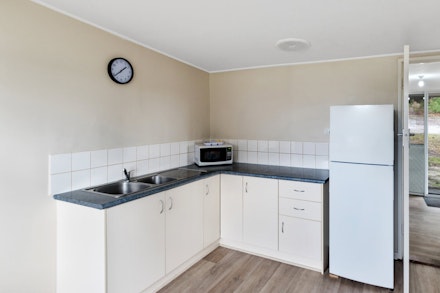 The large living and dining room includes a kitchenette with cookware, crockery, cutlery, fridge, microwave, a small electric or gas cooktop and a small convectional (easy cook) oven. The cabin also includes a bathroom, fresh linen on each bed and bath towels for all guests. The living room also includes a flat-screen television and DVD player.