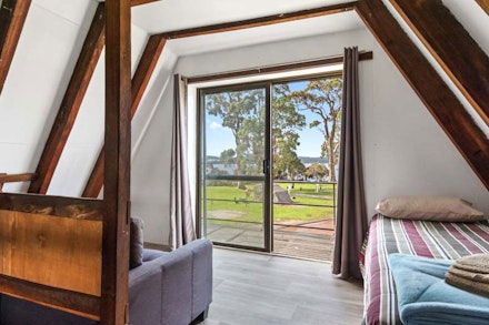 Each A-frame self-contained unit comes with a full bathroom, kitchen, linens, towels, cookware, crockery, and cutlery in addition to a microwave, refrigerator, electric or gas cooktop, electric fry pan, easy cook oven (where a stove is not installed), and TV.